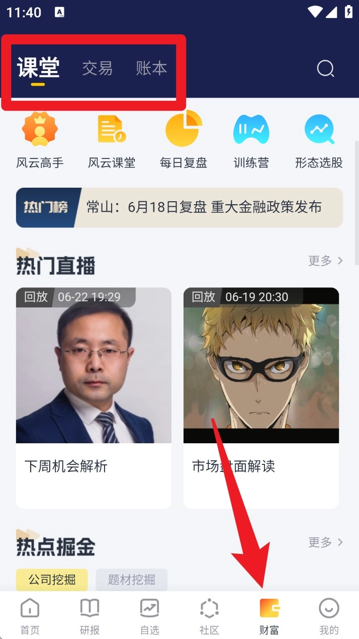 点击底部的财富图标,进入课程专区查看风云课堂、每日复盘等内容,还能观看热门讲解直播,提升交易与资金管理技能。