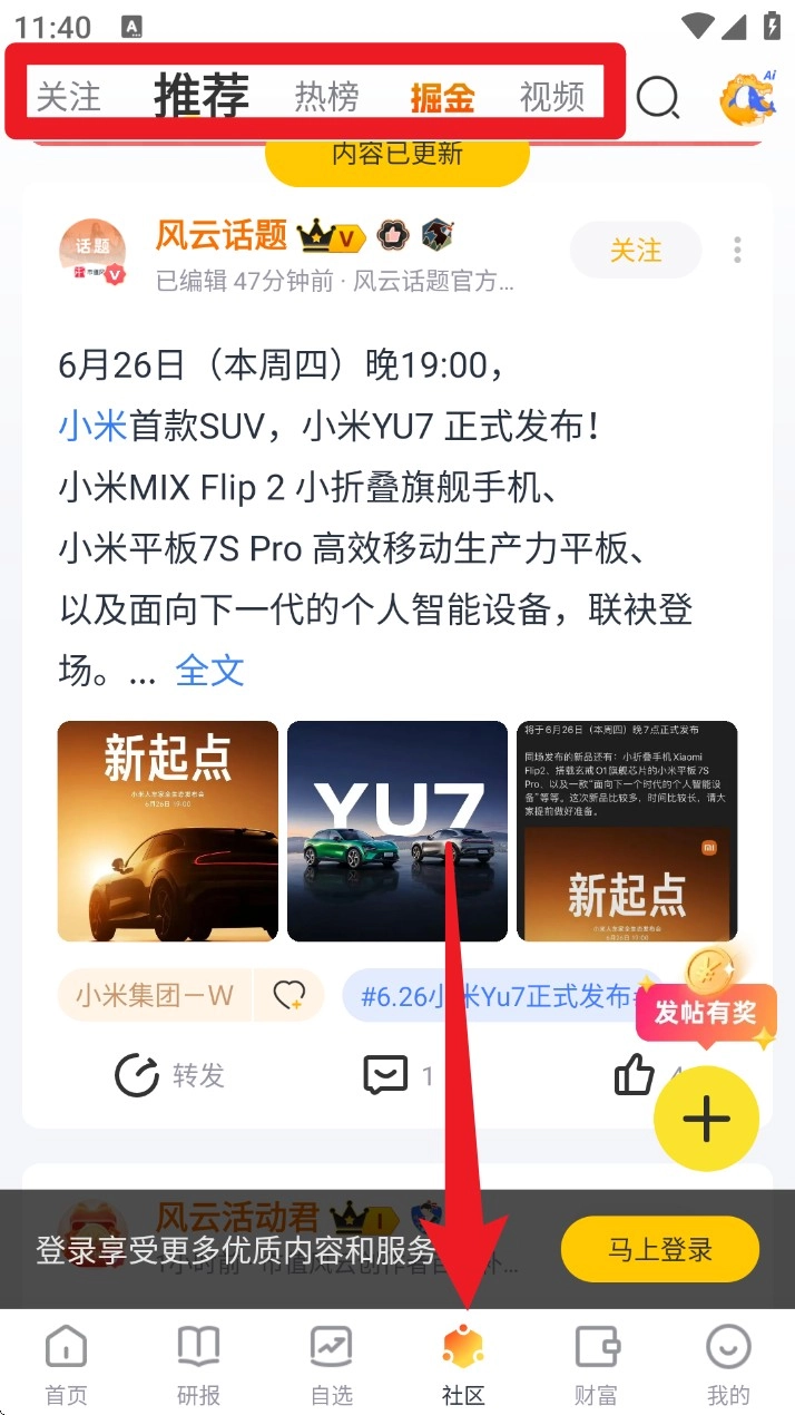 进入社区板块后,能看到实时推荐内容、热门榜单以及掘金专栏,还可以浏览市场热点相关的讨论帖子,同时也能发布个人见解,和其他用户进行互动交流,包括点赞、收藏等操作。