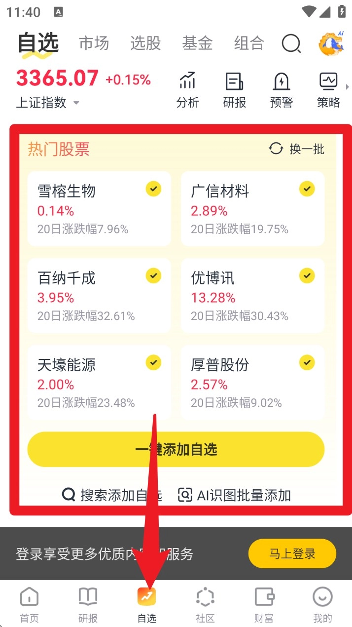 切换到自选页面,就能查看自选股的表现情况以及相关的策略数据,通过点击一键添加功能,或者借助AI识图工具,都可以快速把目标个股添加到自选列表里。