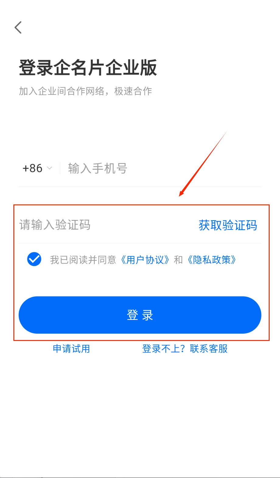 打开进入登录页面后,顶部会显示时间,中间位置是“登录企名片企业版”的标题,下方需要先选择+86的区号,然后输入11位的手机号码。