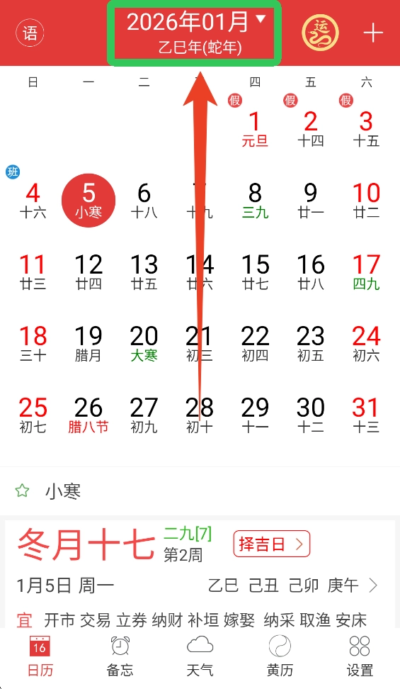 打开软件后,点击上方的"日期"可以更换公历农历。
