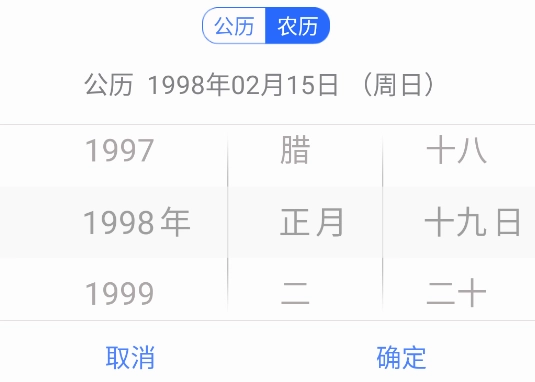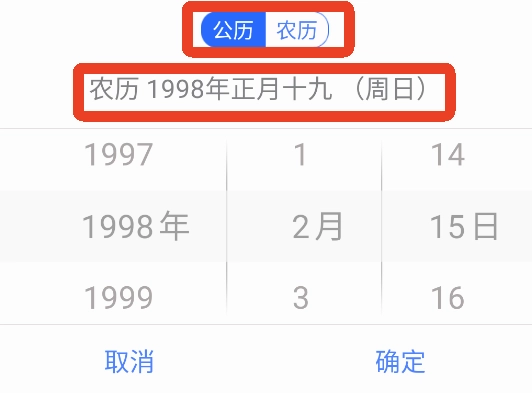 点击公历选项后,挑选好对应的生日日期,其上方的农历区域便会呈现出该公历生日所对应的农历日期。