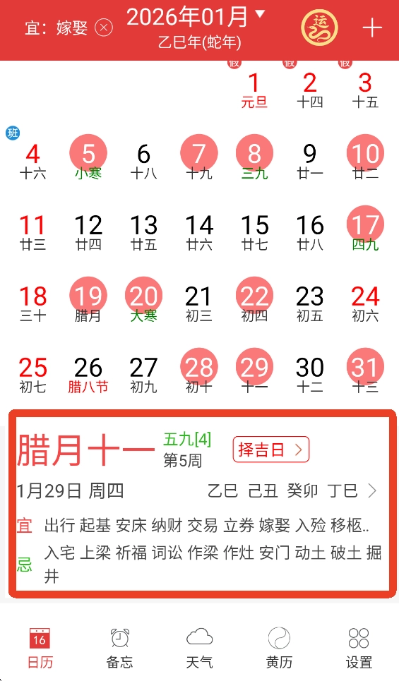 如图所示,系统会自动跳转到日历页面,日历上标注红色圆圈的日期即为朴实吉日。