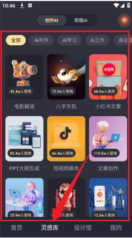 切换到【灵感库】页面,便能使用文案生成、短视频脚本等创意类工具。