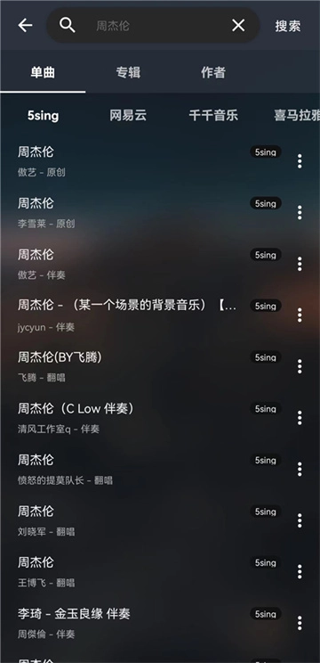 有了音源后,进行音乐搜索就能找到对应的音乐内容,搜索结果会按不同音乐单独呈现,且不同音源下的搜索结果存在差异。