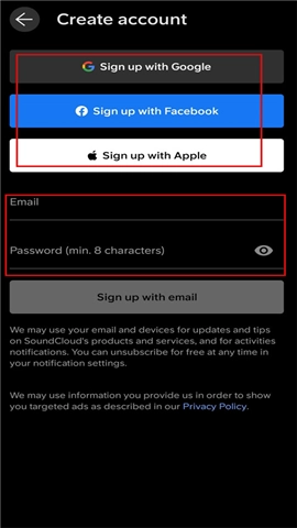 打开SoundCloud应用,点击“create an account”选项,即可启动账号创建流程。
