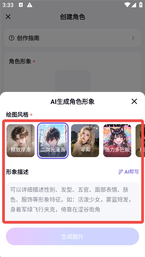 以“AI生成”为例,首先明确你所设定角色的外貌风格,接着可对其性别、面部神态、肤色、衣着等形象特点展开个性化设置。