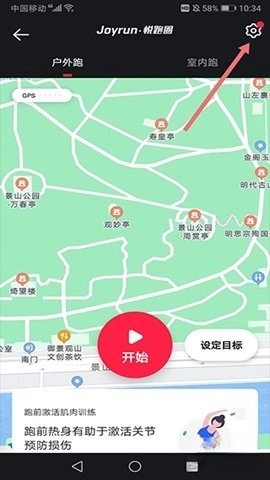进入跑步记录页面后,用户可点击右上角的【设置】图标(即下图中红色箭头所指的区域),对相关功能进行设置。