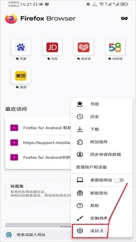 打开火狐浏览器应用,在功能栏中点击“设置”。