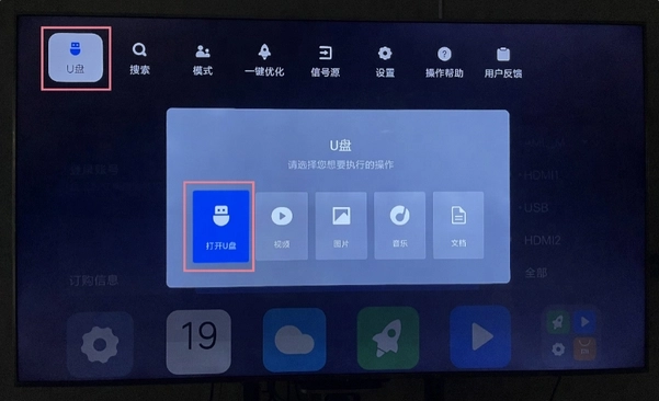 把U盘插到电视上,要是弹出窗口就选择“打开U盘”。要是没弹出的话,可以在电视首页最顶部按“上”键,这样就能找到U盘了。