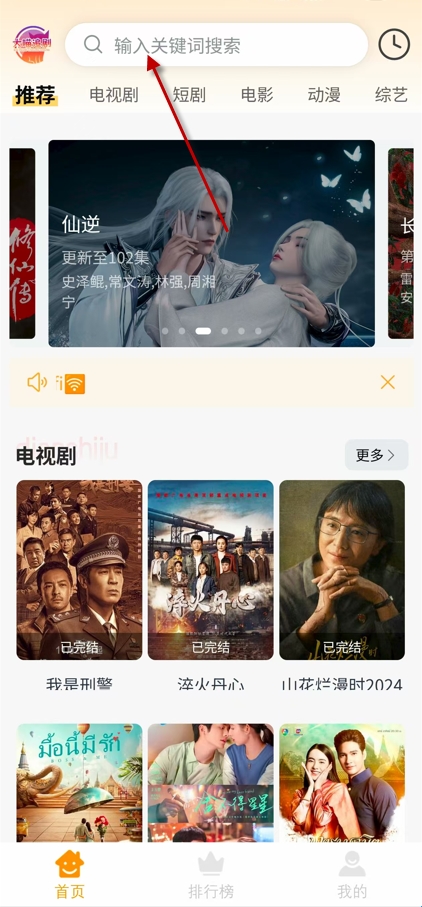 1、下载安装完后进入大喵追剧app,点击首页上方的搜索框,输入想看的影片。