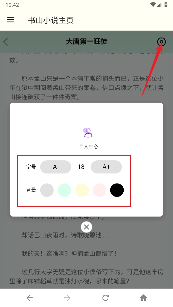 支持字号调整、背景切换、翻页模式等个性化设置。