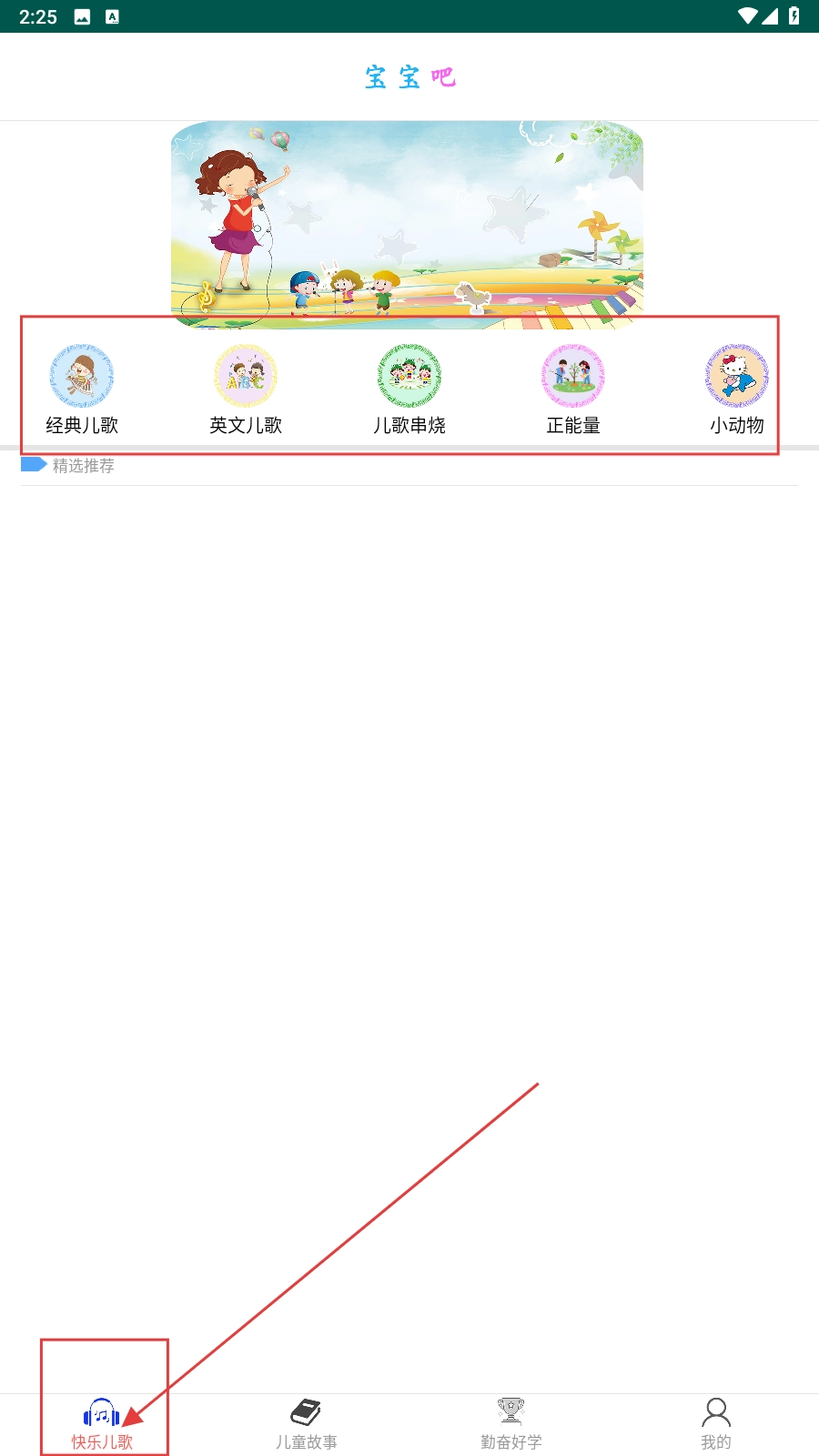 打开应用后,点击底部的【快乐儿歌】按钮。进入该界面,能够选择【经典儿歌】【英文儿歌】等分类,播放对应的儿歌,为孩子开展音乐启蒙。
