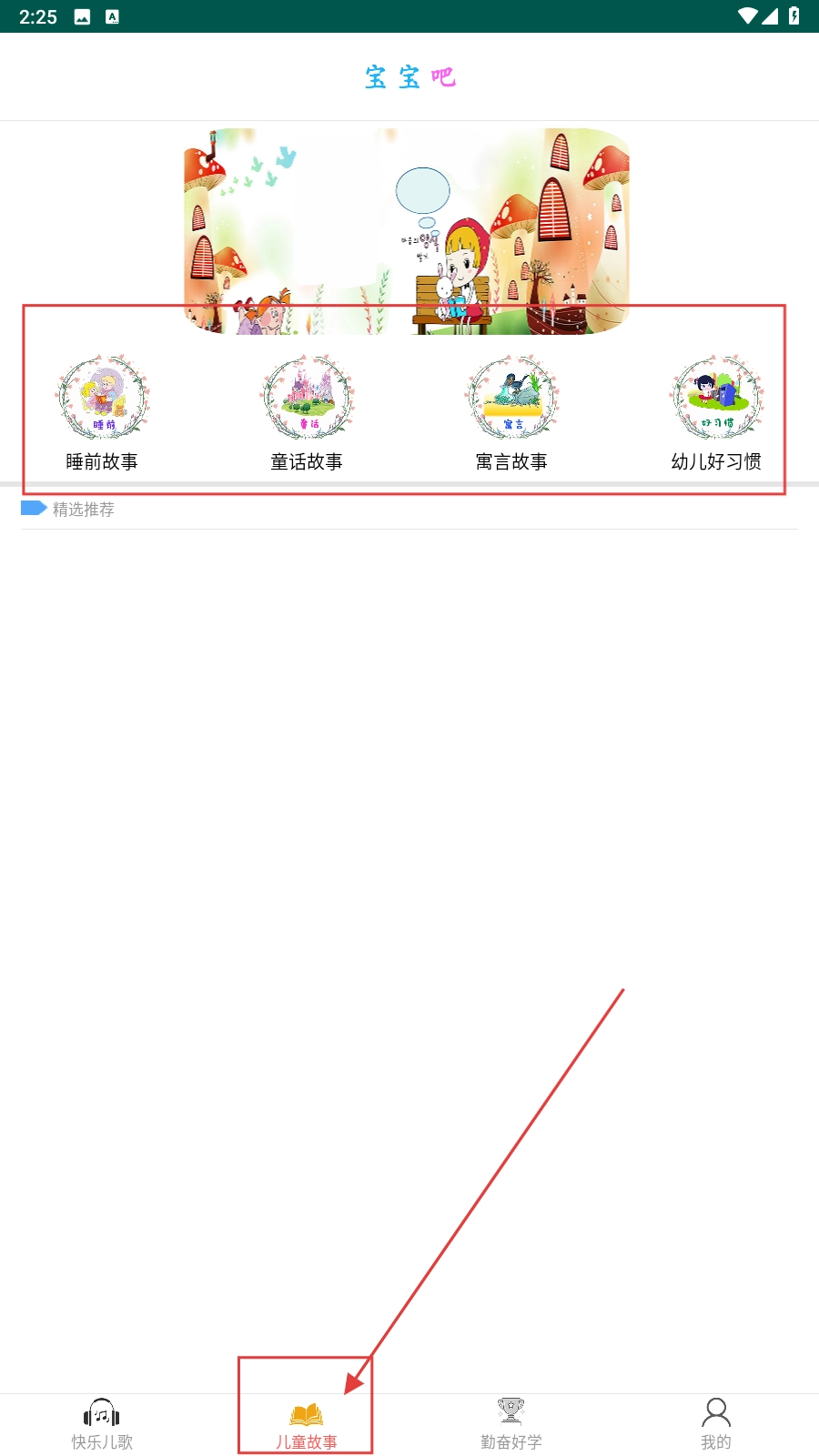 点击底部的【儿童故事】按钮,在当前界面中,挑选【睡前故事】【童话故事】这类分类,播放对应的故事音频,以此来培养孩子的想象力并帮助他们养成良好习惯。