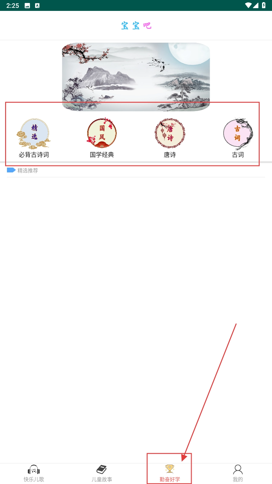点击底部的【勤奋好学】按钮,进入对应界面后,选择【必背古诗词】和【国学经典】这两个分类,通过播放相关的国学内容音频,助力孩子学习传统文化知识。