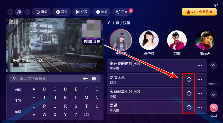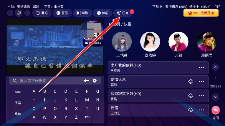 输入首字母就可以选择喜欢的歌曲,点击""图标。