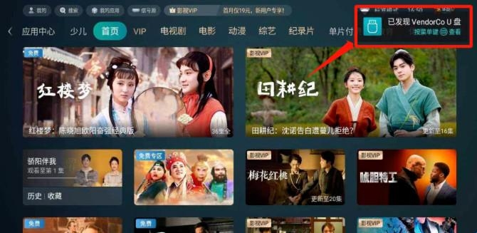 3、将U盘插到电视的USB接口上,在电视右上角会有提示,按菜单键可快速进入,也可以在我的应用里找到媒体中心进入。