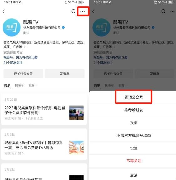 4、把【酷看TV】设为置顶可以方便下次使用打开哦。