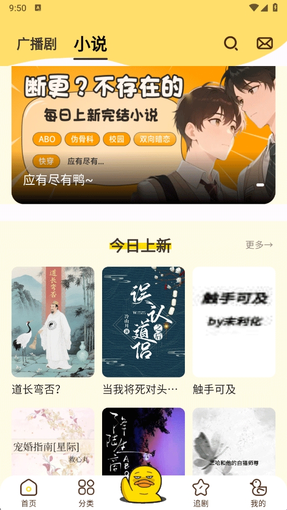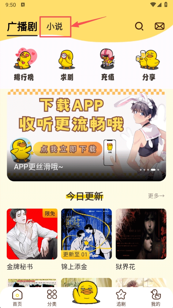 1、app内除了提供广播剧外还提供了小说阅读,在app首页界面内点击顶部小说