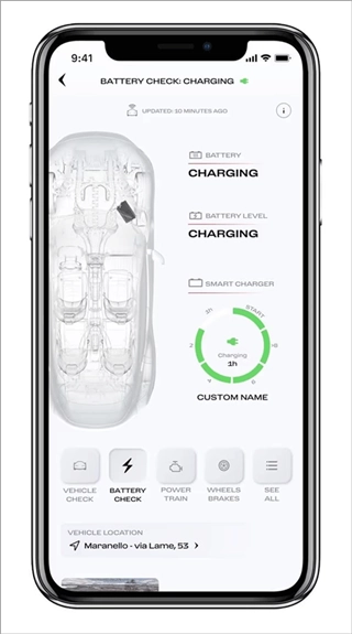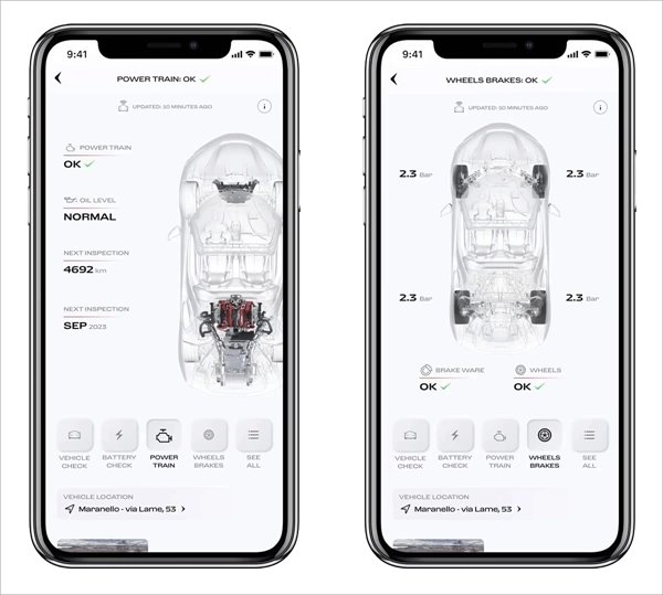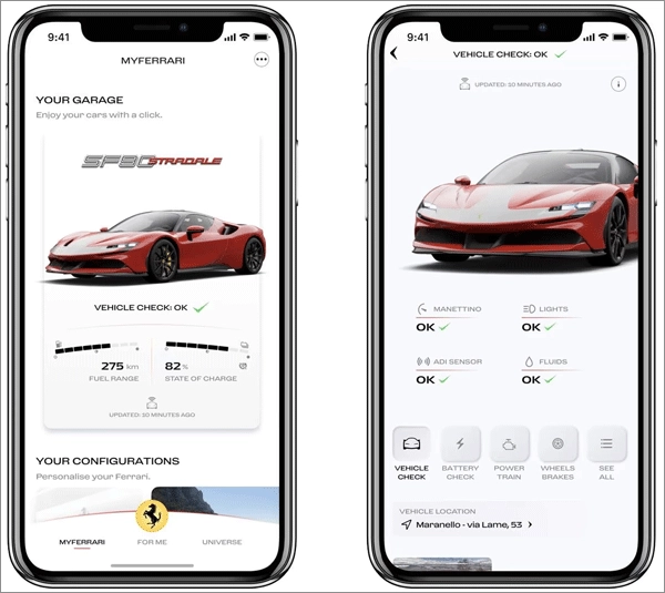 在“我的车库”板块里,您能查看车辆可能存在的问题警报、法拉利Manettino系统状态、灯光、传感器与各类液位情况,以及发动机、制动系统和高压电池(若您的车辆为插电式混合动力车型)的相关信息。此外,您还可以实时掌握车辆的里程数,以及它的最后已知位置——也就是车辆发动机上次熄火时所在的地点。