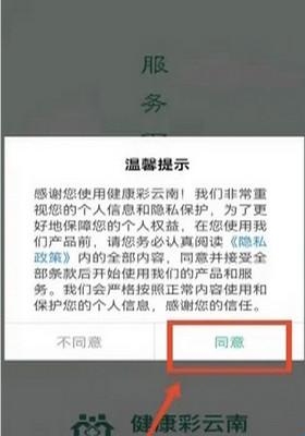 1、软件下载成功后打开健康彩云南APP,点击同意。