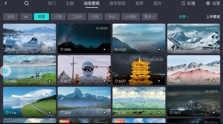 除此以外,布丁桌面主题中心内还有上万款动态壁纸和静态壁纸可供大家挑选,所有桌面壁纸均可预览;点击左上角的搜索键,输入壁纸关键词,例如:"4K"、"风景"、"雪山"、"小鸟"、"二次元"、"美女"、"猫"等关键词,即可轻松找到你想要的壁纸。