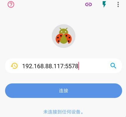 6、手机打开甲壳虫ADB助手软件,点击界面内的搜索键(放大镜),等待几秒,便会出现一个【发现以下设备】的弹窗,点击IP地址进行连接;如果不显示信息可以重新连接一下数据线。