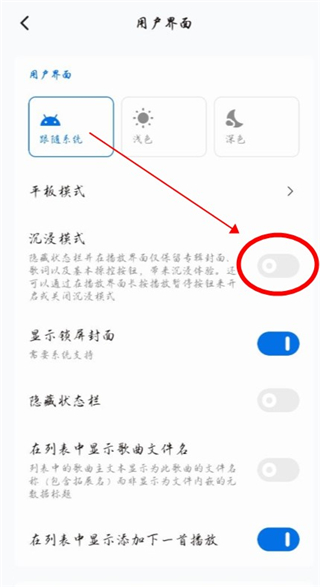 4、在用户界面设置中,找到沉浸模式,点击后面的开关按钮,如图所示: