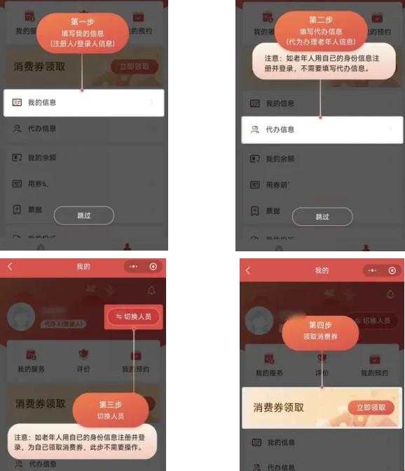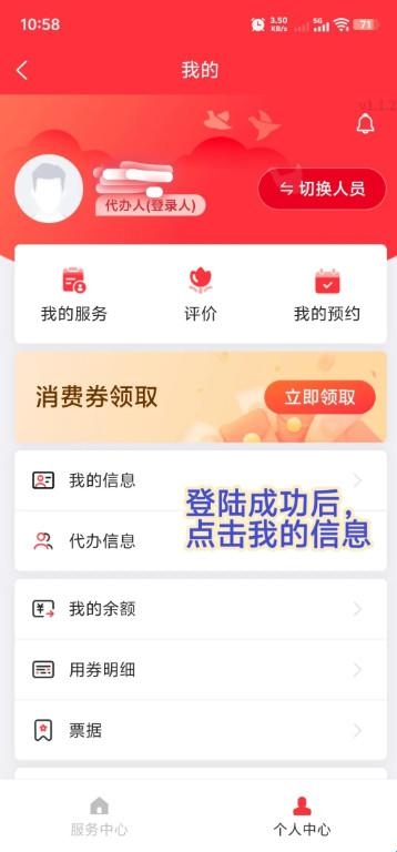 按要求准确填写“我的信息”“代办信息”,完成信息填写并提交后,点击“切换人员”进行切换。点击“立即领取”即可领取消费券。
