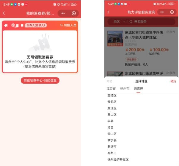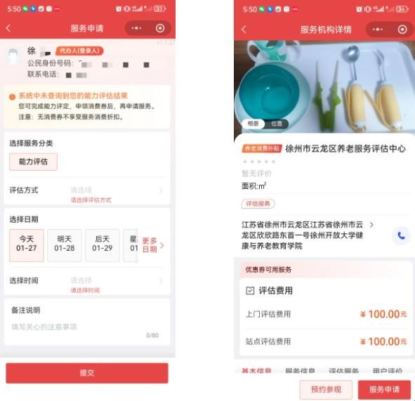 系统会显示您所在区域附近的评估机构列表供您选择,点击相应评估机构的“服务申请”按钮,选择评估方式,预约时间,点击提交。当您被评估为中度以上能力等级后,重复步骤二可领取消费券。