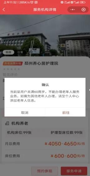 点击“服务申请”后,如果页面弹出一个要求添加老年人信息的对话框,点击对话框中的“前往”按钮,进入“个人中心”页面。