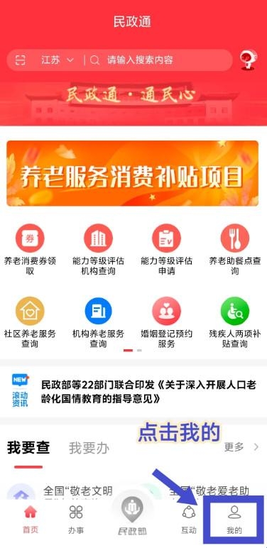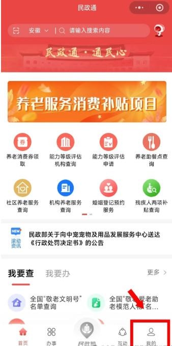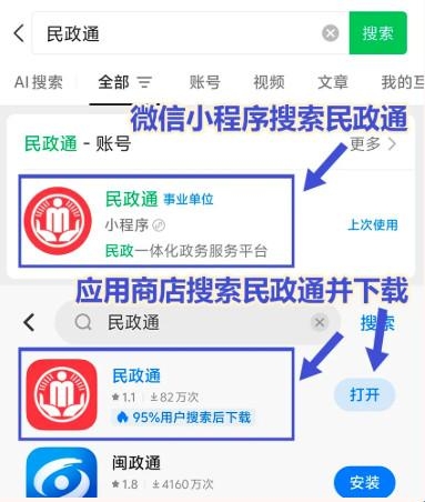 ①微信搜索“民政通”小程序或下载“民政通”APP。