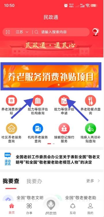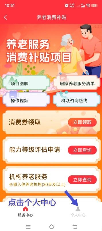 2、找到养老消费券领取入口,在App主页面上,找到并点击“养老消费券领取”。