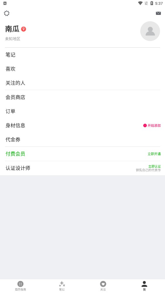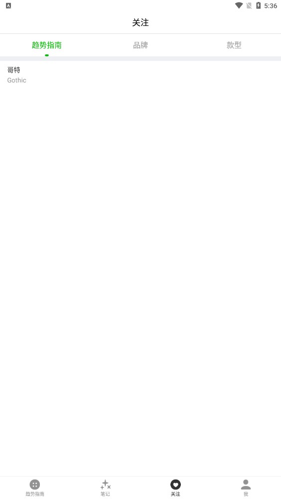 3、登录以后,用户可以在趋势指南、品牌与设计师、款型下面点上小爱心,就可以添加关注,如果有新的内容更新,就可以在【关注】功能栏这里看到;