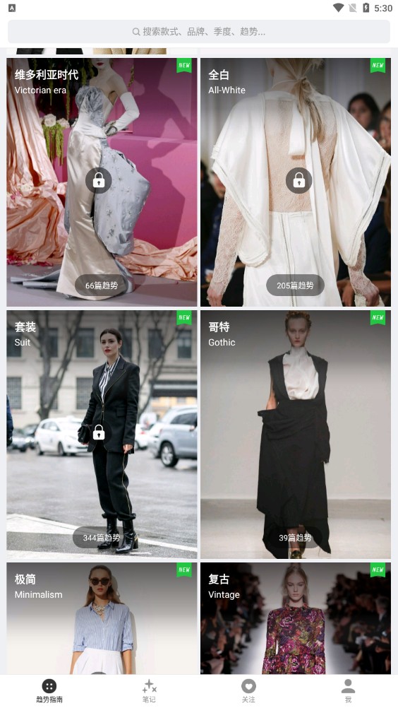 1、在首页中,可以看到数万篇时装笔记,涵盖秀场、街拍、Lookbook等,还可以查看各个年度有关时装的笔记;在上方的搜索栏中可以进行款式、品牌、季度以及趋势等的搜索;