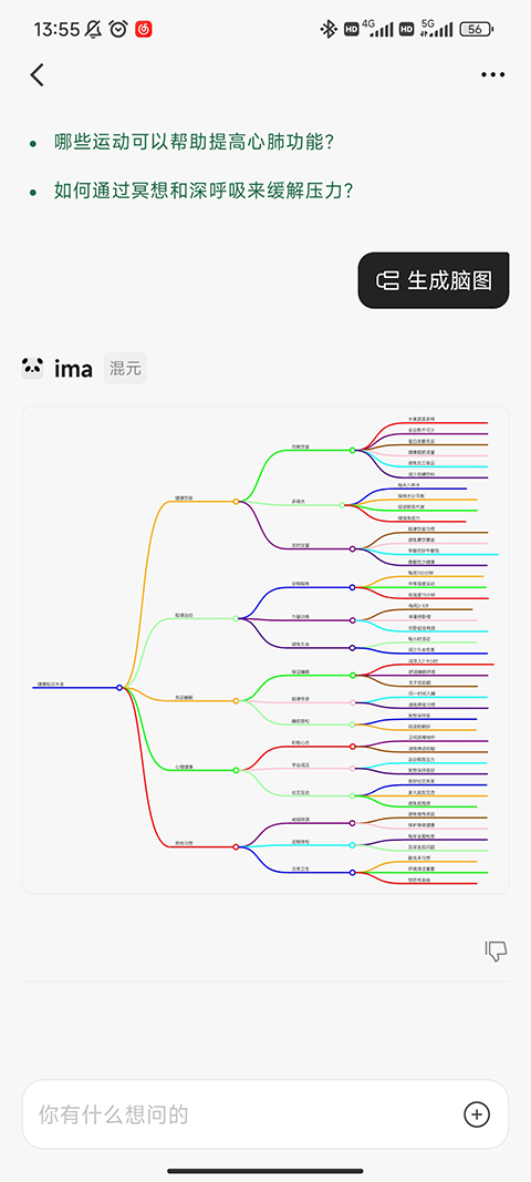 在对话底部的功能栏中点击“生成脑图”,或直接在输入框中发送“生成脑图”,即可基于当前内容生成脑图。