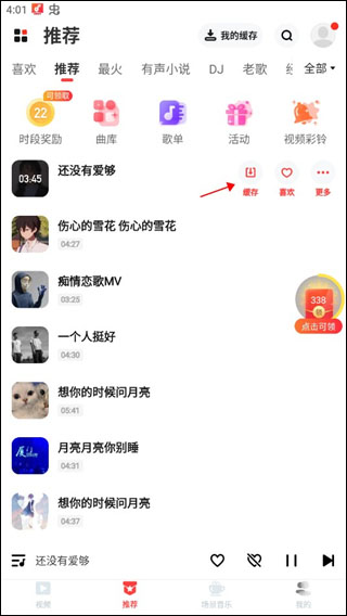 1、打开软件之后,在推荐界面点击自己喜欢的歌曲,选择缓存。