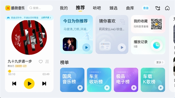 3、酷我音乐车机版与手机App账号互通,个人歌单、收藏等资产同步共享。