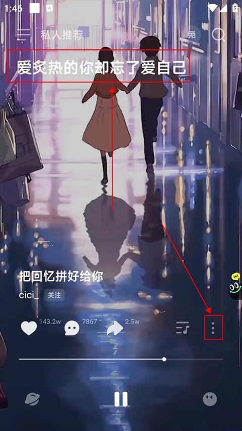 1、进入软件后用户就可以开始使用,软件采用视频音乐模式,在左上方可看到歌词,也可以点击右下角三个点更改播放样式。