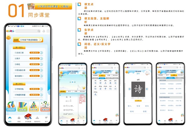 2、全面覆盖,资源丰富。涵盖核心学科,提供课文点读、生字词学习、词语拓展、近反义词整理等功能。