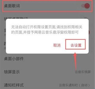 4、点击开启桌面歌词,页面出现一个设置提醒,需要开启网易云音乐悬浮窗权限,点击设置。