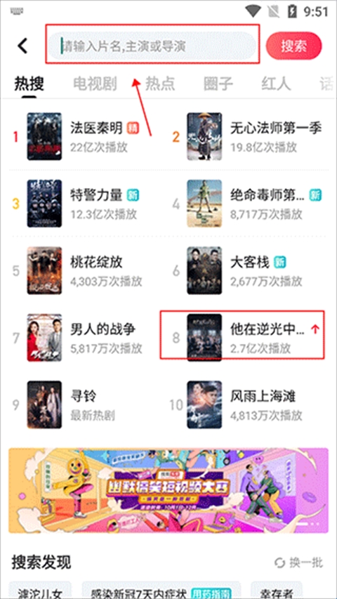 2、会看见很多的近期热搜推荐,如“法医秦明、无心法师第一季、特警力量、绝命毒师、桃花绽放、大客栈、男人的战争、以及他在逆光中”,这里小编选择他在逆光中,作为示例,如果推荐中没有你想要的,在搜索框搜索即可;