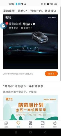 思皓乘用车app是安徽江淮汽车集团股份有限公司推出,软件拥有发现,活动,爱车,商城等板块内容,可以帮助更好的服务思皓车主。