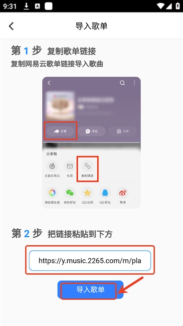 2、将第三方音乐平台的歌单进行分享并复制链接,将歌单链接粘贴进来后点击“导入歌单”