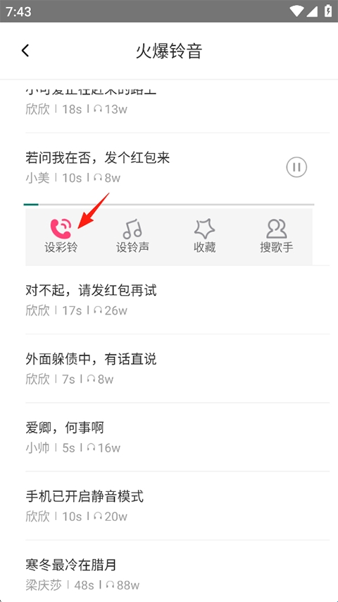 2、点击该铃声,在下方的功能列表中选择设彩铃即可。