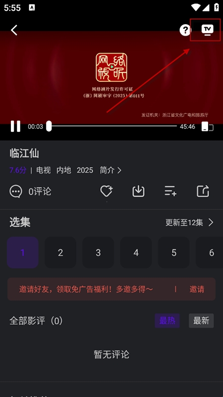 3、打开想看的影片,进入播放页面。点击播放页面右上角的“tv”图标,搜索可投屏的设备。保证手机与投屏设备在同一网络下,点击搜索到的设备名称,完成投屏连接。连接成功后,影片将在投屏设备上播放,可通过手机控制播放进度等。