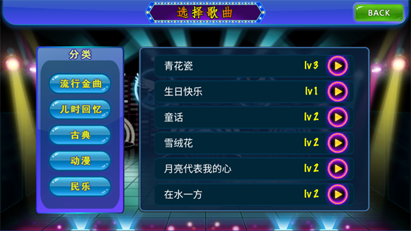 2、在歌曲选择页面的分类栏中,选择想要弹奏的歌曲分类。