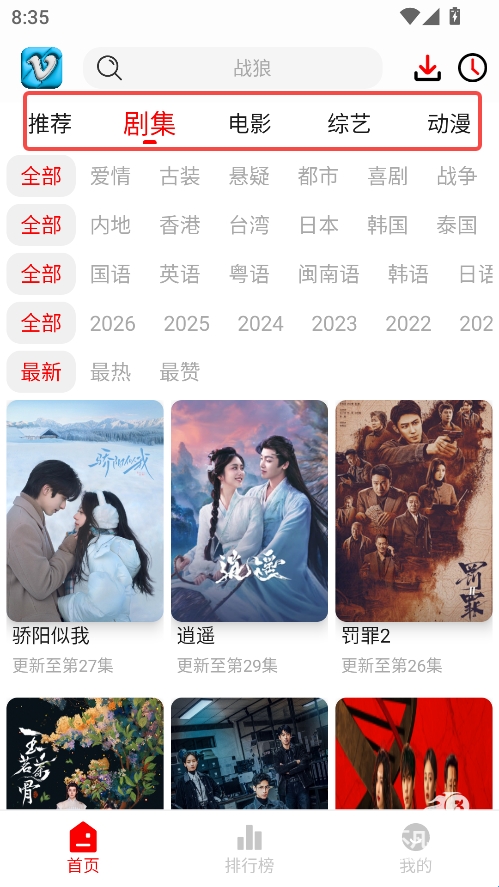 2、点击上方的选项即可切换分区,在分区中能够自由筛选想看的剧。
