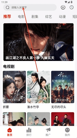 1、打开幕启星河app后,在“首页”的最上面,可以搜索要看的电影、电视剧等;