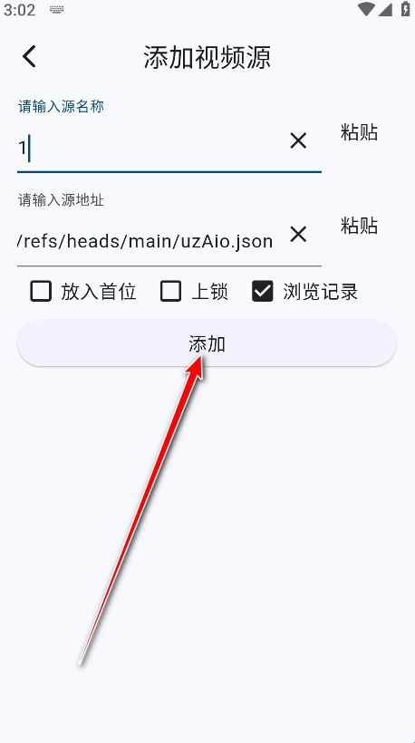 7、填写源名称和源地址(https://ghproxy.cfd/https://raw.githubusercontent.com/YYDS678/uzVideo-extensions/refs/heads/main/uzAio.json),然后点击添加。